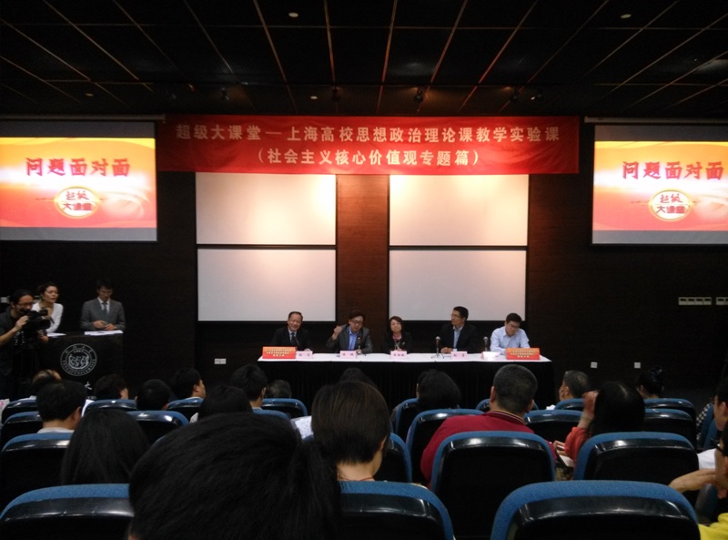 5月15日晚,思政部教师前往同济大学中法中心聆听和学习了由上海市教育委员会主办的“超级大课堂”——上海高校思想政治理论课教学实验课之社会主义核心价值观专题篇。教育部社科司副司长徐艳国,教育部社科司教学处处长陈矛,教育部高校思想政治教育理论课教学指导委员会顾问郑永廷,中央马克思主义理论研究和建设工程首席专家吴潜涛,上海市教卫工作党委副书记、上海市教委副主任高德毅等领导和来自上海市各高校的近200名师生与会。