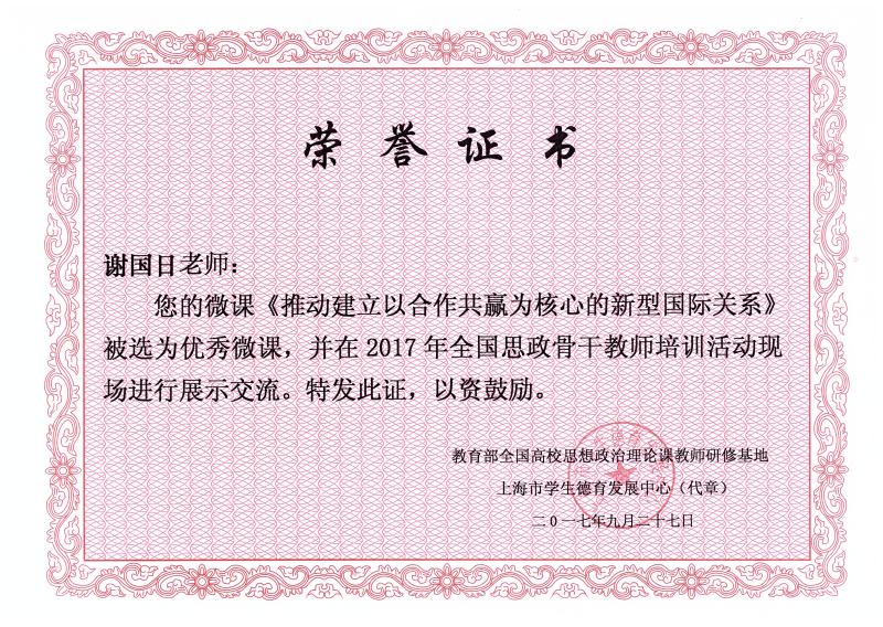 为深入学习习近平总书记系列重要讲话精神,贯彻落实全国高校思想政治工作会议及上海高校思想政治工作会议精神,促进高职高专院校思政课建设,9月27日,由上海“高职高专思政课”分教指委、上海市学生德育发展中心和上海市高职高专院校思政课建设联盟联合主办的全国高职高专思政课骨干教师培训班观摩教学展示环节在上海海洋大学报告厅举行,共有来自全国的四位教师参与展示,我校思政部谢国日老师的微课获评优秀微课,并应邀代表上海地区参加了《毛泽东思想和中国特色社会主义理论体系概论》课第十章“推动建立以合作共赢为核心的新型国际关系”一节的展示,谢老师从教学设计、教学内容、教学方法和教学效果等方面精心准备了本次讲课,在展示过程中稳定发挥,得到认可。参与本次展示的另外三位教师分别来自国家示范高职湖南民政职业技术学院、国家示范高职江苏经贸职业技术学院和国家示范上海交通职业技术学院。