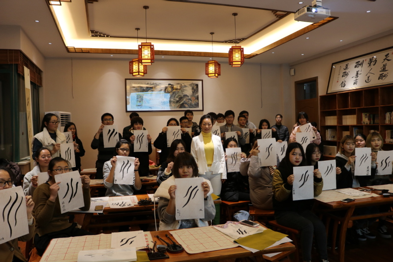 本次讲座中,高教授首先从中国文字历史渊源与中华民族生生不息的关系,结合十九大报告中习近平总书记对文化自信的重要论述,以自身在国外宣传中华文化时的所见所闻以及切身感受来告诉当代大学生中华文化的伟大。随后,高教授对神秘的中国女书进行了介绍,中国女书是古代中国女性的伟大智慧,是联合国承认的存在且仍在使用的唯一女性文字,该文字隽秀美丽,富有艺术性和功能性,在古代中国传女不传男,故为男性不认识的一种神秘文字。高教授以互动和讲授相结合的方式介绍完中国女书的背景和渊源后,用中国女书现场展示书写了“上善若水”四个字,并向大学生传授书写中国女书的要领,手把手纠正和鼓励在场大学生用中国女书书写“水”字,最终在场所有同学都完成了自己的第一幅女书作品。