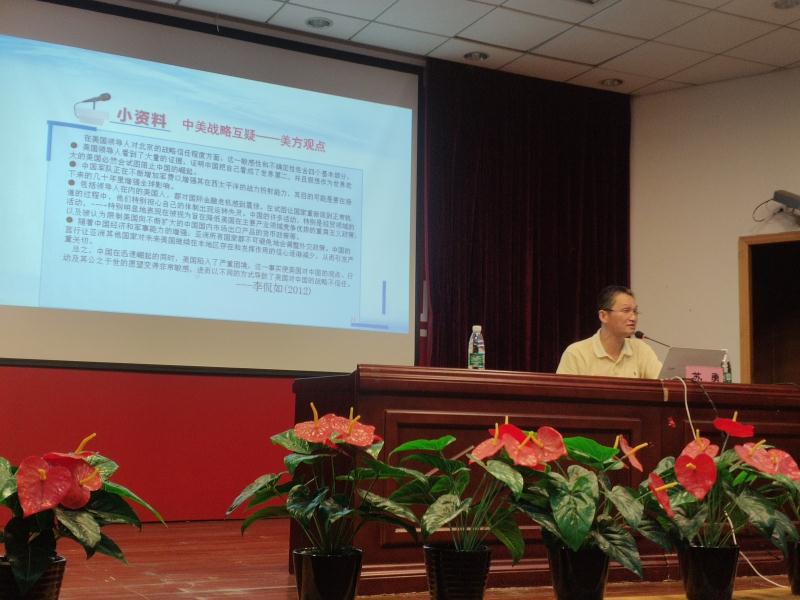 9月20日晚上6点,我院思政部特邀上海第二工业大学苏勇老师为师生作了题为《深入调整的大国关系----中美贸易摩擦辨析》的形势与政策课专题教学。报告由思政部主任丁晓红教授主持、思政部教师和全体2018级新生通过报告厅现场学习和教室直播的方式聆听了报告。