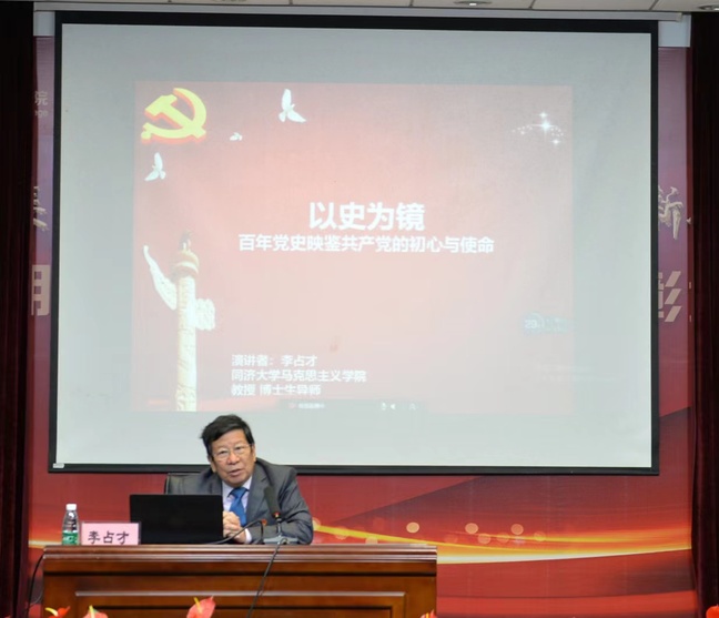 开班仪式后,同济大学马克思主义学院教授、博导、全国高校思想政治理论课教师年度影响力人物、享受国务院政府特殊津贴专家、我校“李占才名师工作室”主持人李占才教授为师生们作开班首讲,他的授课题目是《以史为镜——百年党史映鉴共产党员的初心与使命》。