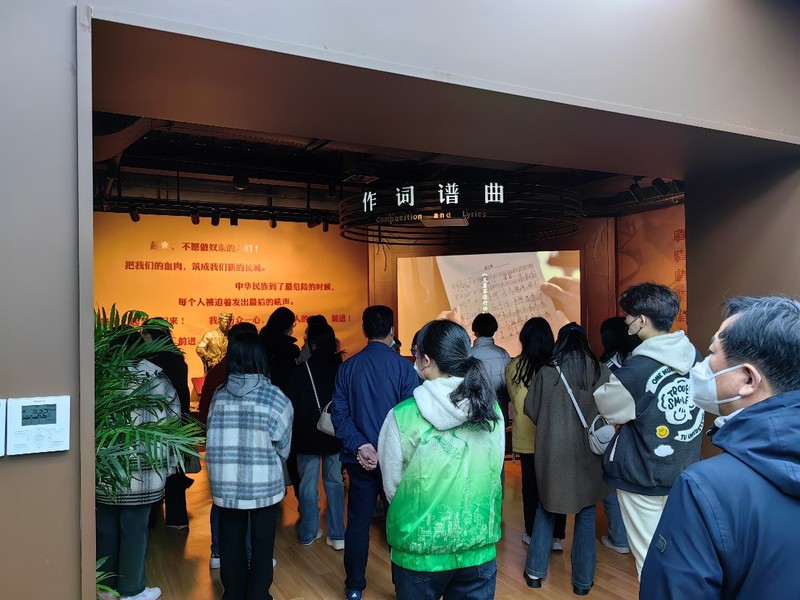 之后,师生们来到坐落在杨浦区荆州路的国歌展示馆,在一位中学生志愿者的带领和讲解下,全面了解《义勇军进行曲》从电影《风云儿女》的主题曲到成为中华人民共和国国歌的历程,详细查考《义勇军进行曲》诞生、传播及其深远影响的历史,深切领悟中国共产党领导中国各族人民在历史中不断奋斗的精神。