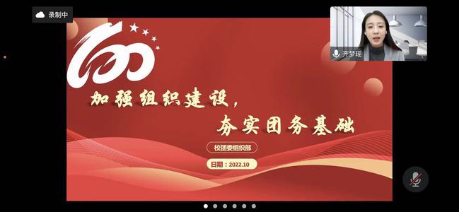 齐梦瑶老师从五个方面为大家解读了如何加强组织建设,夯实团务基础,让我们更加规范的开展今后的团务工作。首先是共青团团章的领学,介绍了共青团的基本任务,基本特征和基本要求;第二个方面介绍了新时代团的基层建设,着重带领我们学习了《关于加强新时代团的基层建设着力提升团的组织力的意见》,表明加强团的基层建设的重要性和紧迫性;第三个方面是高校团组织换届工作中需要注意的问题,并举例了同济大学的换届流程;第四个方面是关于团费收缴、使用与管理,指出按照团章规定向团组织缴纳团费,是共青团员必须具备的起码条件,是团员对团组织应尽的义务;最后一个方面是关于团支部工作条例,齐老师给大家讲了《中国共产主义青年团支部工作条例》出台的背景及意义,阐明了新时代共青团的职责使命。