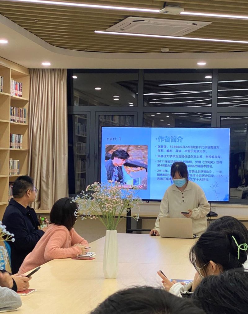 进入读书心得分享环节,同学们就近期阅读的书籍进行了分享。同学分享的书籍主要有:《活着》、《老人与海》、《月亮与六便士》、《城南旧事》、《人生》等多本优秀的小说,同学们纷纷发表自己的观点和感受,讨论的过程很是热烈。
