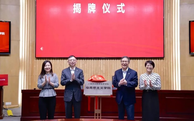 ◆同济大学党委书记方守恩、上海市教卫工作党委一级巡视员郑锦、中共宝山区委宣传部副部长周洁、董事长周家伦共同为马克思主义学院揭牌(从左到右依次为:周洁、方守恩、周家伦、郑锦)