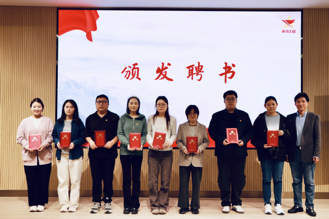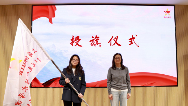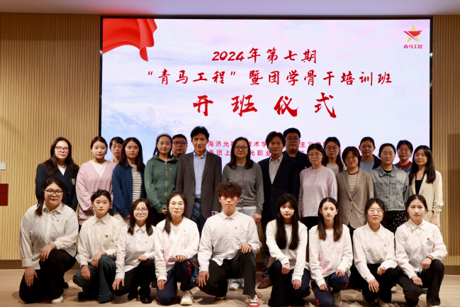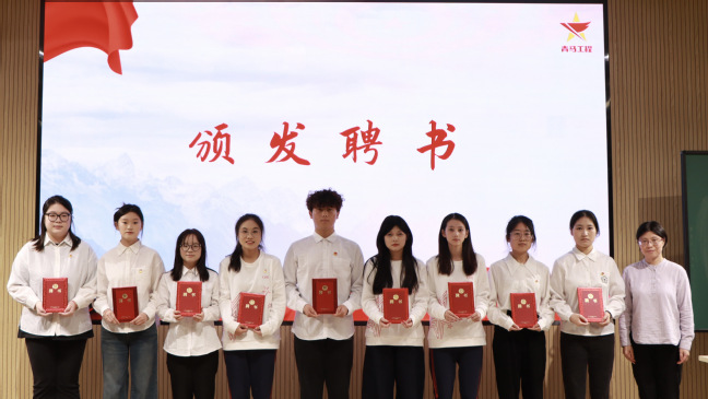 杨小勇为8位指导老师颁发了聘书,毛燕静为9位青马学生组长颁发聘书。刘丽为青马学习班授予班旗,本期青马培训班班主任,马克思主义学院院长助理张贝贝老师上台接受班旗。开班仪式后,各位领导专家老师和学员代表上台合影。