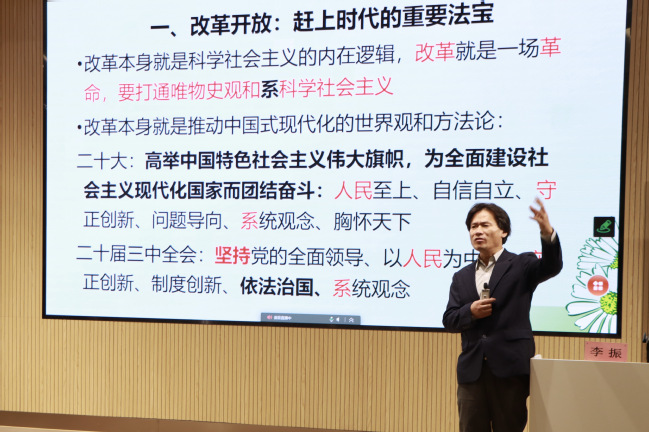我校马克思主义学院邀请了来自同济大学的李振教授为师生们讲授了本期学习班的第一课《改革与中国式现代化》。李振老师是复旦大学哲学博士,上海财经大学经济学博士后,现为同济大学马克思主义学院教授、博士生导师。授课伊始,李振老师以“改革开放是重要法宝”这一比喻为切入点,着重辨析,对改革开放进行了深入剖析,从而开启了本期培训的主题。然后李振老师从明晰改革是科学社会主义的内在逻辑,到何为“进一步”,再到以辩证法诠释何为全面,层层递进诠释改革的发展,内容趣味生动,发人深思。接着以幽默的方式详细地分析了“西方”现代化,以及从逻辑关联、历史关联、文明关联、实践关联四个方面,探讨了中国式现代化和高水平社会主义市场经济体制的联系,从而对现代化和中国式现代化进行了区分,表明中国式现代化是中国共产党领导的社会主义现代化,它有着基于自己国情的中国特色。最后李振老师对改革与中国式现代化的授课内容进行了总结。