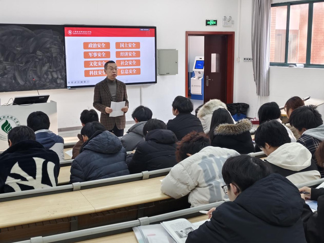 授课过程中,王云飞副校长条理分明地梳理核心内容,从总体国家安全观的八大领域展开系统解读,深入阐释国家安全的丰富内涵与重要意义,让学生认识到国家安全是安邦定国的基石;随后聚焦校园实际,细致讲解涵盖人身安全、财产安全、网络安全、消防安全等六大方面的校园安全知识,紧密结合学生学习生活场景,全方位划清安全红线、明确防范重点。